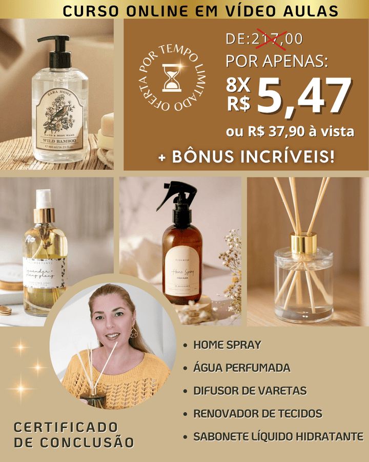 Você vai aprender com vídeo aulas rápidas, objetivas, do mais ABSOLUTO ZERO, mesmo sem experiência e vai criar sua própria linha de Aromas de Ambiente para iniciar seu NEGÓCIO DE SUCESSO.